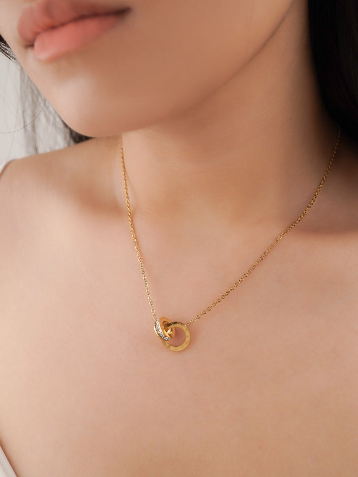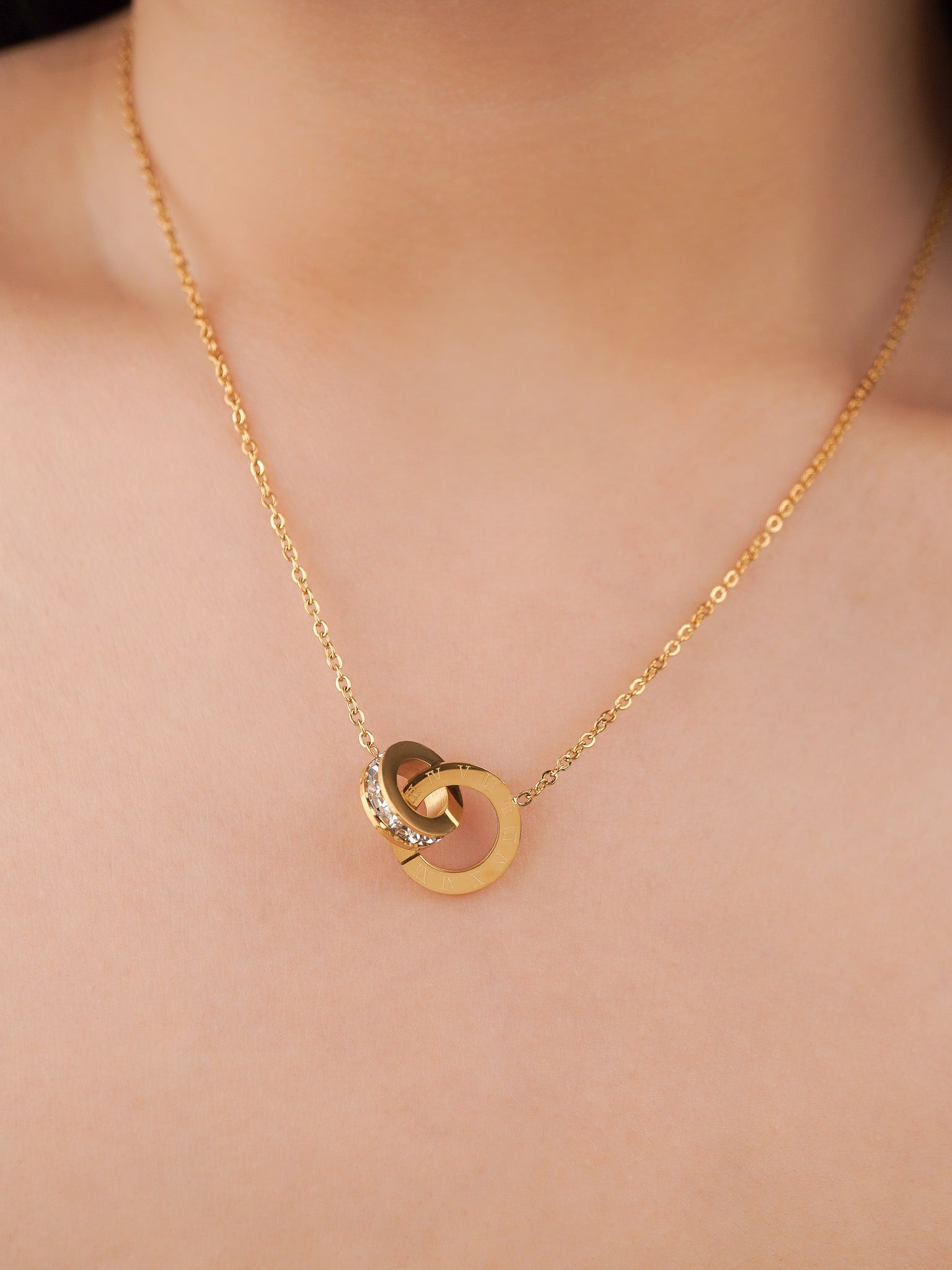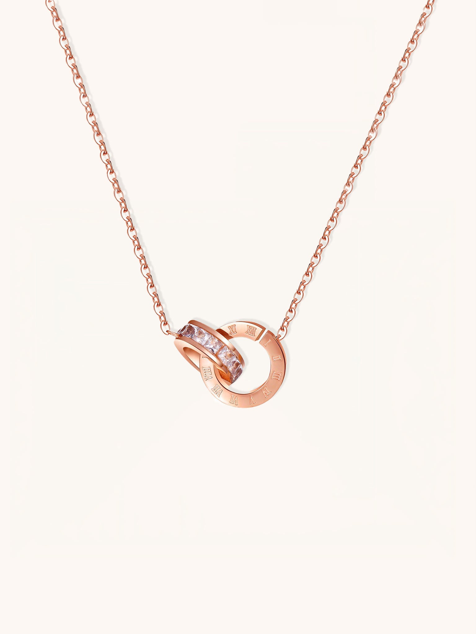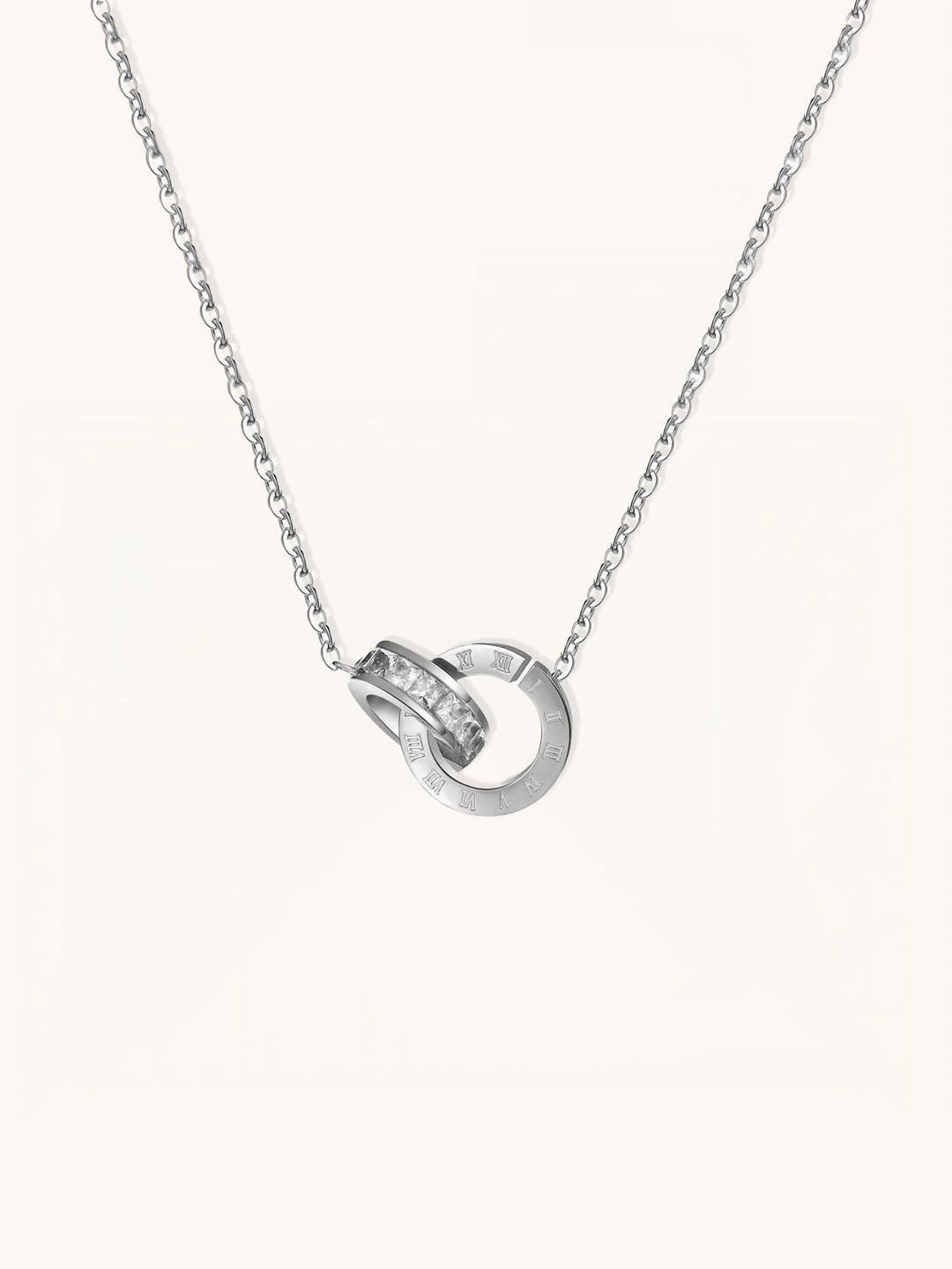 A timeless favorite, redefined with modern elegance. The Classic Roman Numerals Diamond Band Necklace features interlocking rings—one adorned with bold Roman numerals, the other accented with shimmering stones. This symbolic design represents eternity, strength, and connection, making it a meaningful piece for daily wear or gifting.