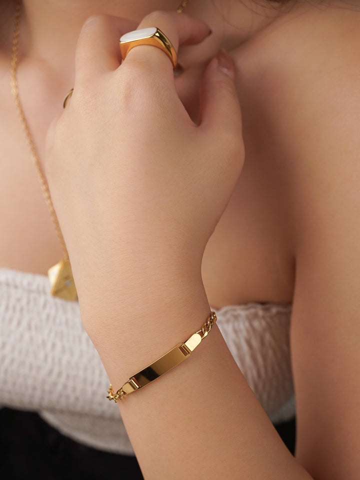 The sleek Figaro chain is paired with a smooth engravable plate, allowing you to etch initials, a name, or a special date — transforming it from a bracelet into a timeless keepsake. Available in both men’s (18cm) and women’s (16cm) sizes, it’s a versatile piece perfect for everyday minimalism or as a matching couple’s bracelet.